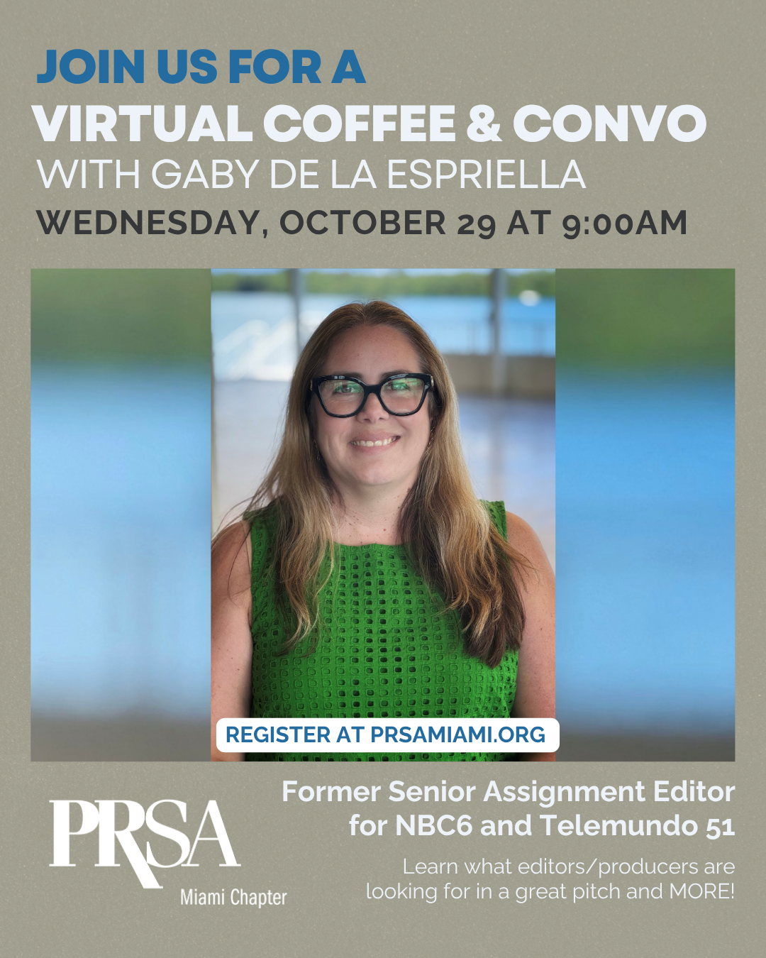 Join PRSA Miami virtually in our latest Coffee & Conversation series featuring Gaby De La Espriella, former Senior Assignment Editor for NBC6 and Telemundo 51. Gaby will share her insights after 20+ years on assignment desk. Learn what editors/producers are looking for in a great pitch, what NOT to do when calling the assignment desk and the role Ai plays when pitching releases.